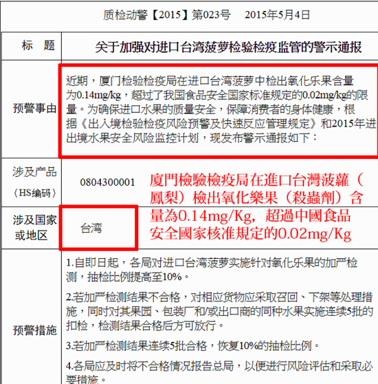 早在2015年,销往中国大陆的凤梨占比达89%,厦门检验检疫局就发布警示,指出台湾菠萝中存在农药超标问题。