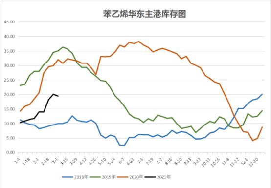 最后我们从供应、下游需求开工率,港口社会库存简单比较下当下与去年下跌过程中的异同点。外围装置集中检修成为推动两次行情上涨的主要因素。据隆众资讯统计,去年十月外围检修量达到阶段高峰随后逐一递减,伴随行情回落。今年2月意外的检修量再度加剧国内EB阶段供需紧张,特别在2月出口高于往年,导致月底交割货源紧张加速行情上涨。虽然按计划接下来两月国外检修依旧递减,但与去年不同,可以肯定未来需求一定比去年好,所以即使国外装置恢复一定供应未必可以满足需求,所以从这一角度不具有对行情推断性。