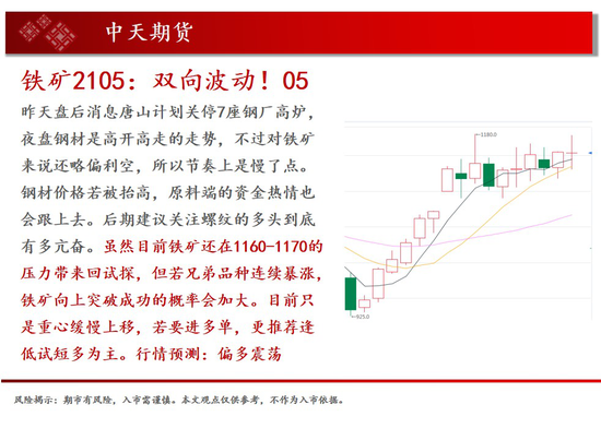操作建议:虽然目前铁矿还在1160-1170的压力带来回试探,但若兄弟品种连续暴涨,铁矿向上突破成功的概率会加大。目前只是重心缓慢上移,若要进多单,更推荐逢低试短多为主。行情预测:偏多震荡