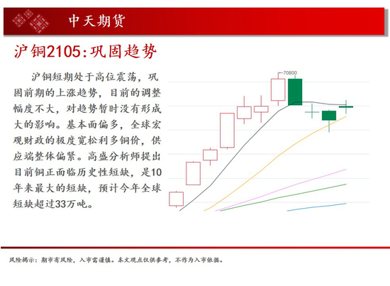 基本面概述:基本面偏多,全球宏观财政的极度宽松利多铜价,供应端整体偏紧。高盛分析师提出目前铜正面临历史性短缺,是10年来最大的短缺,预计今年全球短缺超过33万吨。