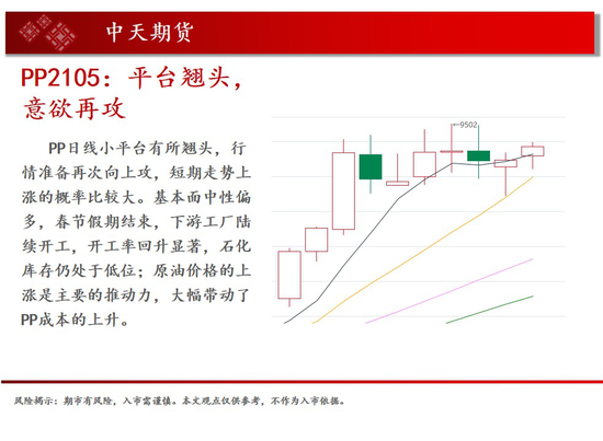 基本面概述:基本面中性偏多,春节假期结束,下游工厂陆续开工,开工率回升显著,石化库存仍处于低位;原油价格的上涨是主要的推动力,大幅带动了PP成本的上升。
