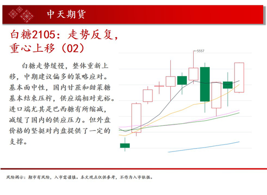 基本面概述:基本面中性,国内甘蔗和甜菜糖基本结束压榨,供应端相对充裕。进口端尤其是巴西糖有所缩减,减缓了国内的供应压力。但外盘价格的坚挺对内盘提供了一定的支撑。