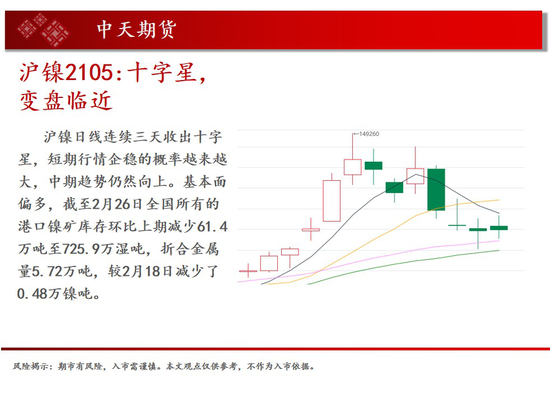 操作建议:沪镍日线连续三天收出十字星,短期行情企稳的概率越来越大,中期趋势仍然向上。