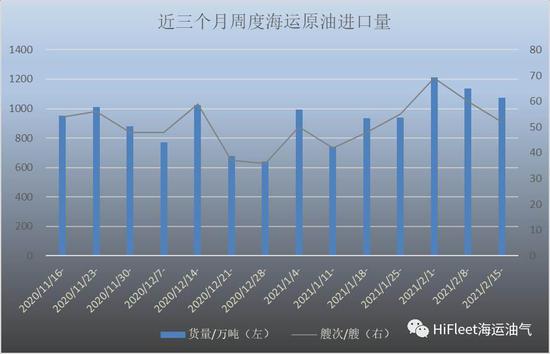 2月第一周(02.01-02.07)中国海运原油进口量约1381万吨,前周进口量1040万吨;第二周(02.08-02.14)进口量约1149万吨;第三周(02.15-02.21)进口量约1073万吨。