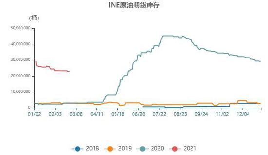 截止至2021年02月26日,中国INE指定交割油库原油库存合计22,822,000桶;其中浙江油库(包括中国石化册子岛、中化兴中和中油大榭)库存合计1,774,000桶;山东油库(包括青岛董家口、中国石化日照、中化弘润)库存合计5,460,000桶;上海洋山库存为1,220,000桶;大连中石油库存6,821,000桶。