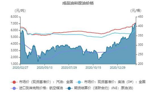 截止至2021年02月26日,当日全国汽油现货价格为7,130元/吨,航空煤油现货价格为3,526元/吨,柴油现货价格为6,033元/吨。