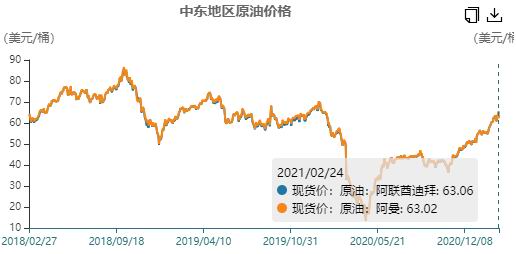 截至2021年02月25日,阿曼原油现货价格为65.41美元/桶,阿联酋迪拜原油现货价格为65.56美元/桶,ESPO现货原油价格为66.91美元/桶。
