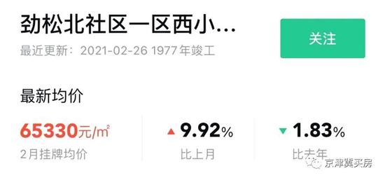 劲松北社区一区2月挂牌均价65330元/平,同比去年下降1.83%,环比上月上涨9.92%。