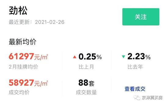 劲松区域二手房最新成交均价为58927元/平。2月挂牌均价612979元/平,同比去年下降2.23%,但有止跌转涨的趋势,环比上月上涨0.25%。