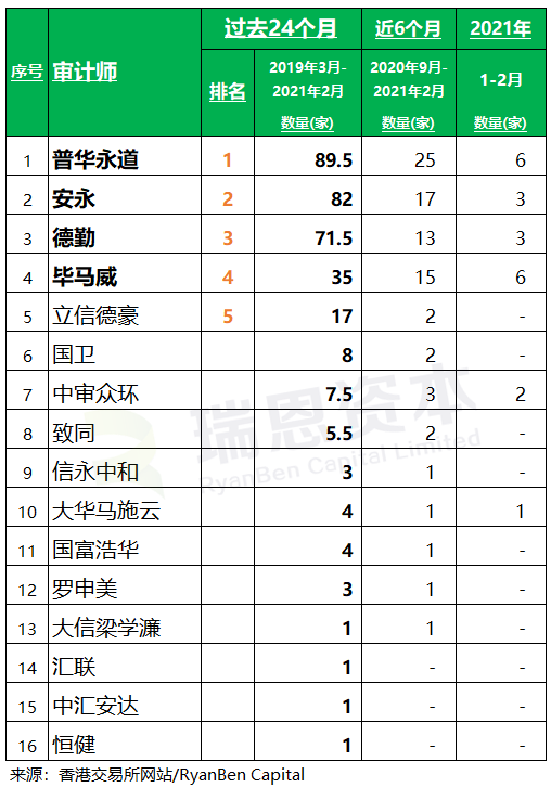 二、香港IPO审计师排行榜(2019年3月-2021年2月)