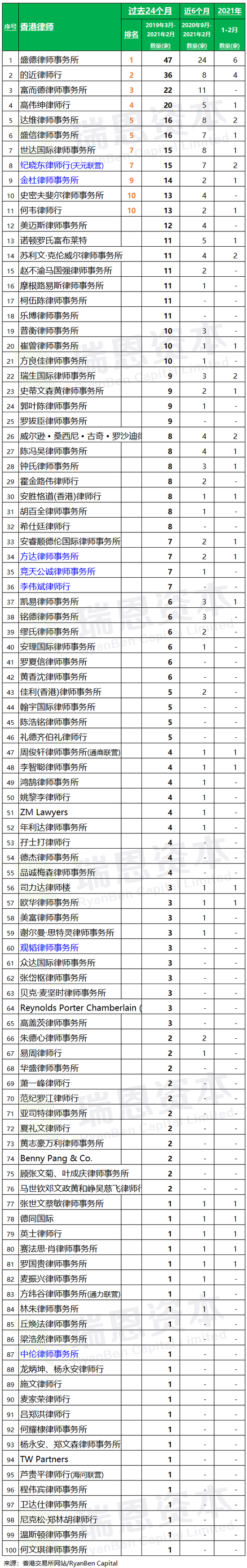 就2021年首两个月来看,共 21间香港律师参与 14 家新上市公司的律师业务。
