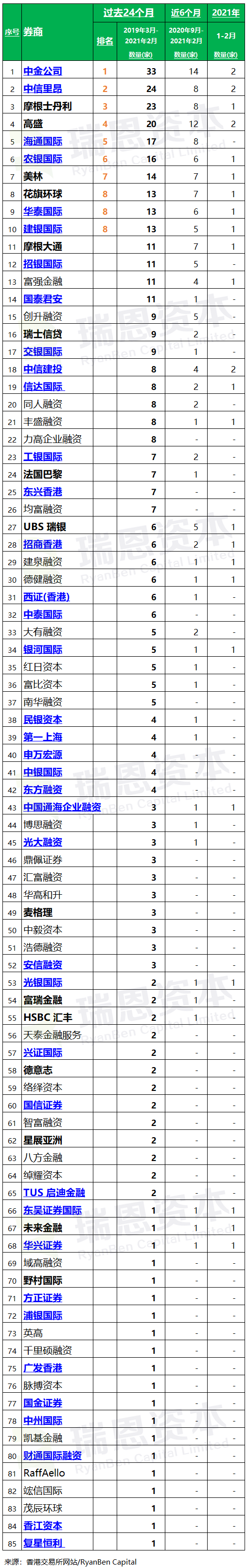 一、香港IPO券商(保荐人)排行榜(2019年3月-2021年2月)