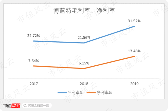 同时,博蓝特的毛利率、净利率也在2019年上升明显。2019年毛利率为31.52%,上涨了10个百分点!净利率也上升7个百分点!
