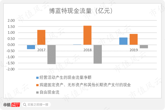 虽然博蓝特的经营现金流量净额逐年增加,但是自由现金流却常年为负数,因此手头也并不宽裕。2017-2019年自由现金流分别为:-1.58亿、-1.55亿、-0.29亿。