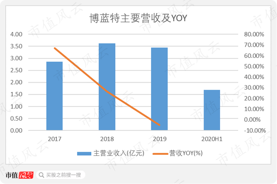 2019年,博蓝特主营业务收入为3.45亿,略低于2018年的3.62亿,同比下降4.7%;2020年上半年的主营业务收入为1.69亿。