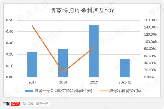 2019年博蓝特归母净利润由0.25亿上升至0.46亿,增速为84%,2020年上半年归母净利润为0.16亿。