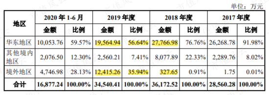 相反,2019年华东地区的营收金额由2.78亿下降至1.96亿,营收占比也由76.76%下降至56.64%。