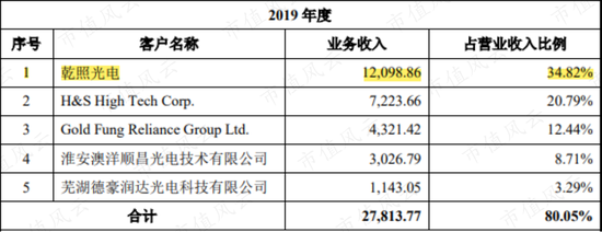 2019年,乾照光电为博蓝特带来1.21亿收入,占当年营收的34.82%。回顾2017-2020年上半年,来自乾照光电的营收分别占博蓝特总营收的29.08%、29.08%、34.82%、29.07%。