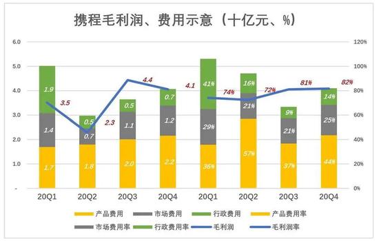 用蓝色折线代表毛利润(率)、彩色堆叠柱代表费用(率)。除非天灾人祸,绩优股携程的蓝色总是能“淹没”彩色。