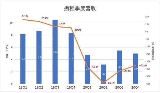 2020年一季度疫情突发,主要影响到春运的后半程,携程营收下降42.1%;