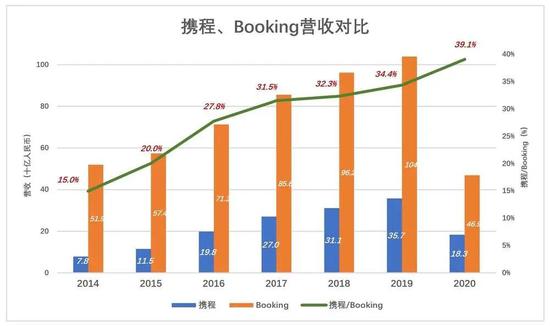 2020年,携程营收提至Booking的39.1%;其中,四季度这个比例达到58.1%,两家营收从未如此接近。