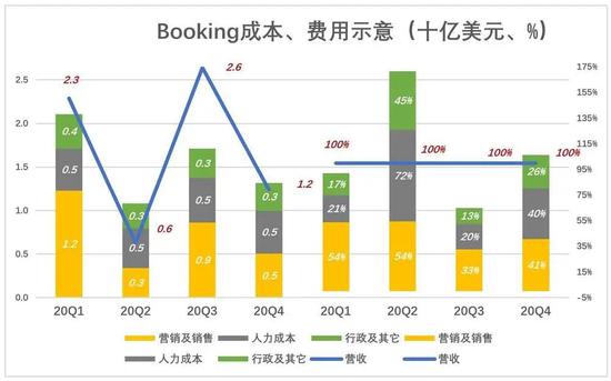 2020年Q4,Booking营收12.4亿美元,同比降幅扩大到62.9%,费用率再度突破到 106%,携程费用率被控制在83%,携程胜出。