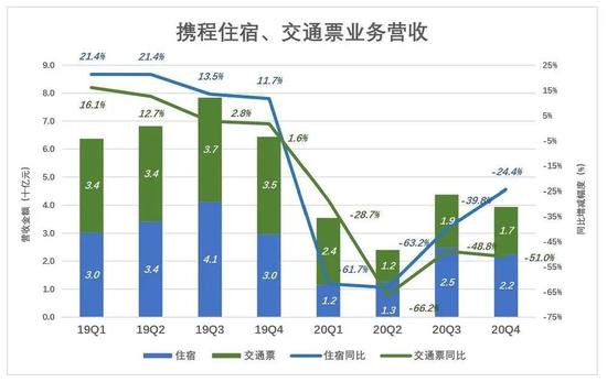 2020年Q1、Q2住宿业务营收跌幅均在60%以上,形势严峻;出人意料的是,Q4住宿业务收入恢复到2019年同期的75%以上。交通票收入只略高于2019年Q4的50%。
