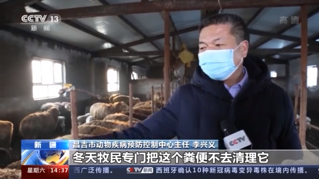 昌吉市动物疾病预防控制中心主任 李兴义:冬天牧民专门把这个粪便不去清理它,厚厚的这一层粪便,发酵以后它产生一定热量,羊在这个粪便上,就像温床一样的,起个保暖作用。