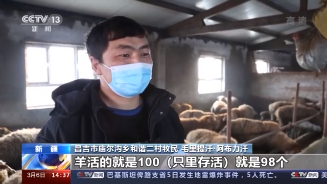 昌吉市庙尔沟乡和谐二村牧民 毛里提汗·阿布力汗:外面天冷的时候,我们把羊娃抱过来(在圈里过夜)。我们这个羊活的就是100(只里存活)就是98个。