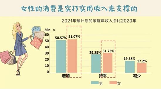 女人们消费的底气从哪来?大调查发现,预计今年收入跟去年持平和增加的女性数量都高于男性,女性的消费也是实打实用收入来支撑的。