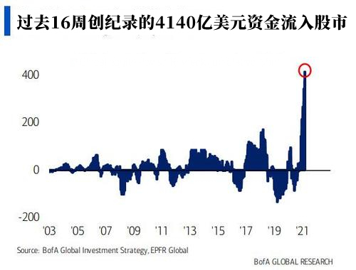 然而,根据最新的EPFR基金流动数据,上周有222亿美元的新资金流入了股市,再前一周流入了462亿美元,为史上第三大的资金流入记录,使16周总流入额达到令人震惊的4140亿美元,如下图所示: