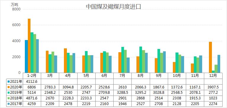 进入2021年后,进口煤的实际进口量并未向之前市场预计的那样出现暴涨。海关总署周日公布的数据显示,我国2021年1-2月煤及褐煤进口量为4112.6万吨,为最近5年同期最低水平,并较去年同期水平下滑39.5%。