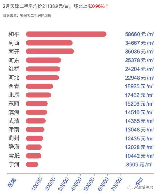 在二手房方面,同样呈现出涨势。援引安居客资料数据,2月天津二手房挂牌均价21138.9元/平,环比上涨0.96%。其中,静海涨幅最大,达到4.46%,在新房市场“拖后腿”的南开上涨3.24%,一举超越河西,位列第二。2月除了东丽、北辰、宁河三区价格下降外,其余13区全线“飘红”。