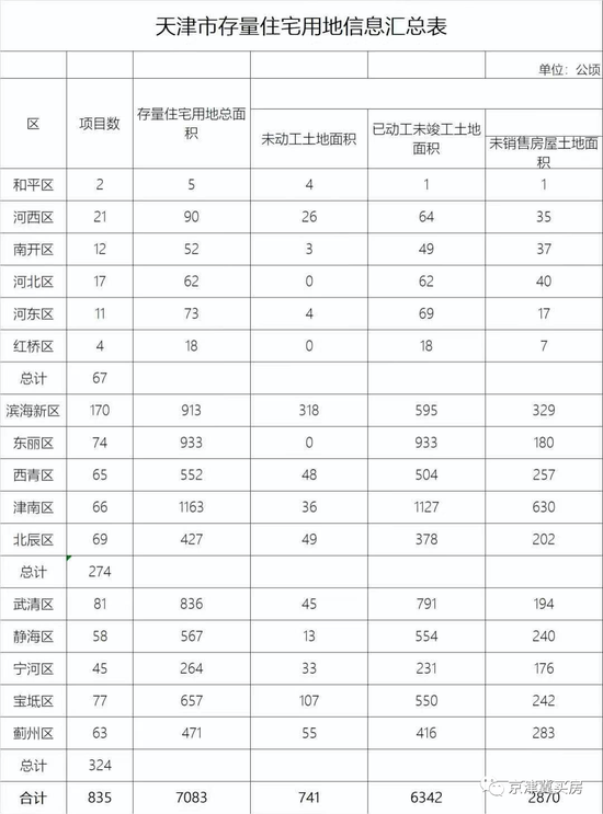 高供给必然带来高库存。2021年初,天津市规划局公布2020年天津存量住宅用地信息,全市合计存量项目数835个,存量住宅用地总面积高达7083公顷。其中未动工土地总面积为741公顷,已动工未竣工土地面积为6342公顷,未销售房屋土地面积为2870公顷。