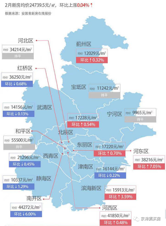 安居客数据显示,2月天津新房均价24739.5元/平,环比微涨0.04%,在14个区域中呈现出6区上涨、6区下滑、4区持平、东部“飘红”、西部“飘绿”的特点。