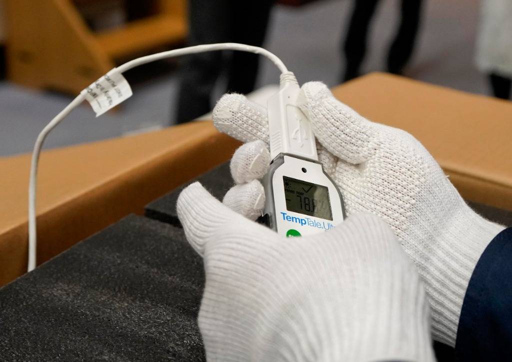 2月16日,工作人员在日本东京的一所医院内递交疫苗时测量温度。(新华社发,Pool图片,间山公雅摄)