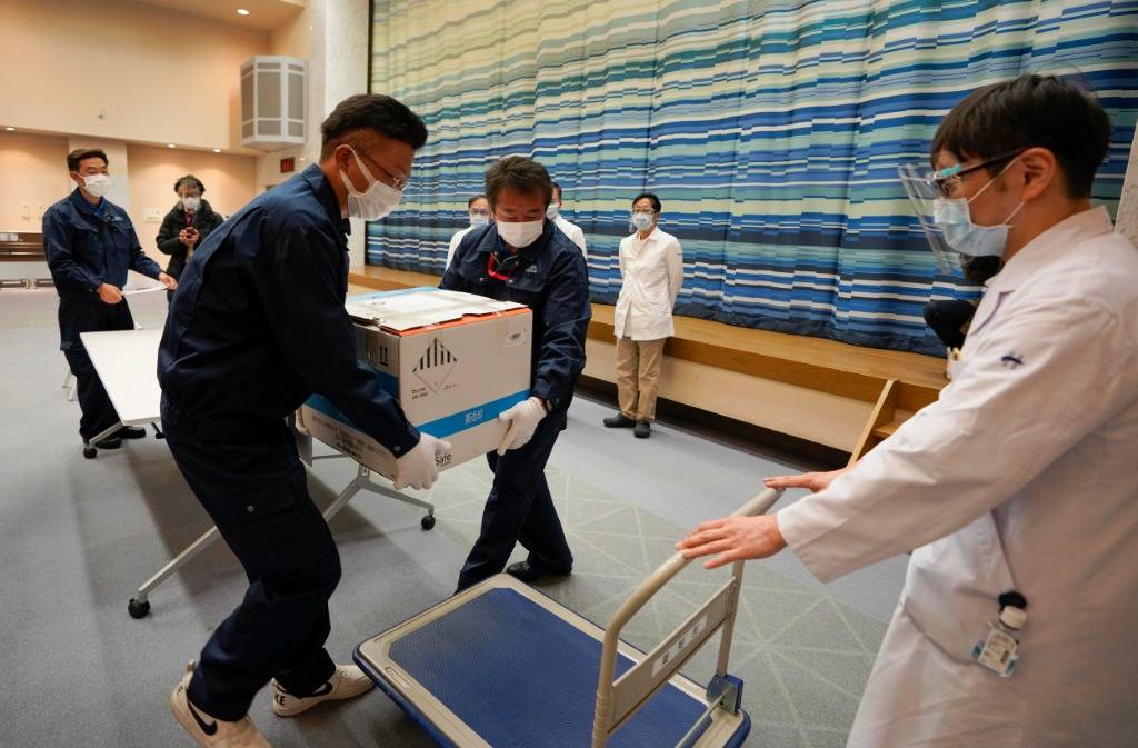 2月16日,工作人员在日本东京的一所医院内搬运疫苗。(新华社发,Pool图片,间山公雅摄)