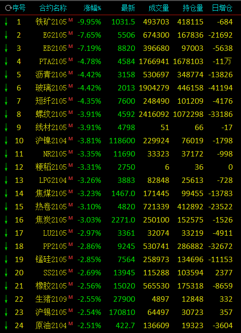 热点栏目3月9日,国内商品期市收盘多数下跌,黑色系领跌,铁矿石尾盘触及跌停,收盘跌9.95%,玻璃跌逾4%,螺纹跌近4%,焦煤、热卷、焦炭跌逾3%;化工品期货多数下跌,乙二醇、苯乙烯跌超7%。有色中,沪镍跌近4%。涨幅方面,鸡蛋尾盘拉升涨近3%,纯碱涨逾2%。