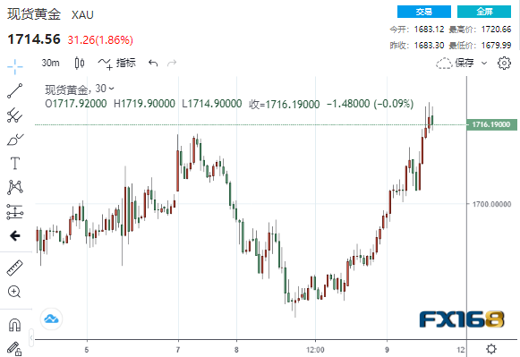 (现货黄金30分钟走势图,来源:FX168)