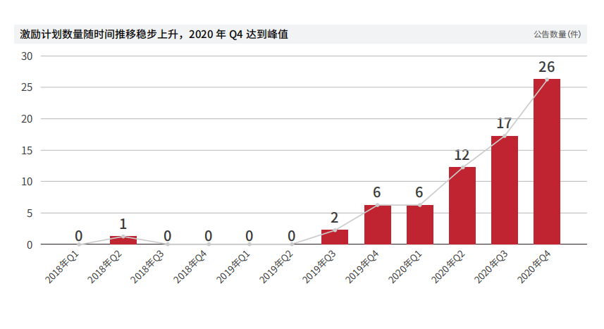从统计数据来看,在科创板于2019年6月13日正式开板后,自2019年第三季度起,科创板公司公告的股权激励计划数量逐季度上升。2020年第四季度发布的股权激励计划公告数量最多,为26个。