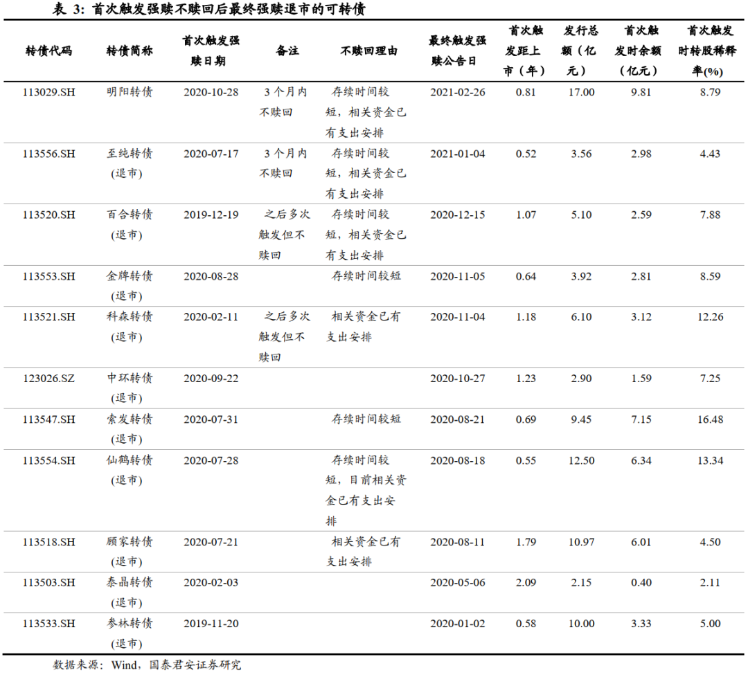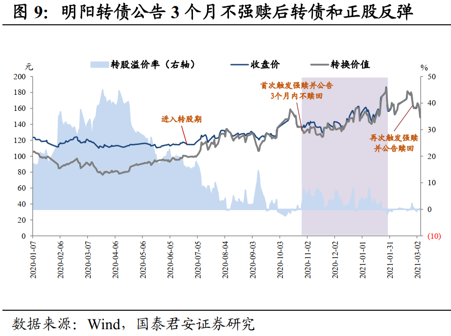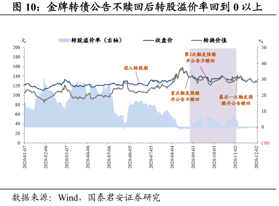 转债触发强赎后公告不赎回对转债和正股价格的影响。有些转债公告不赎回时承诺未来一段时间不赎回,如明阳转债,2020年10月28日触发强赎后公告未来3个月内不强赎,之后明阳转债价格和对应正股价格迅速反弹,并且转股溢价率在之后三个月的“安全期”内回到5-10%,且在三个月后再次触发强赎前回到0附近。大部分转债首次触发强赎但公告不赎回后并未承诺不赎回时间段,如金牌转债,触发强赎前转股溢价率降到0以下,在公告不赎回后回到0以上,并在即将再次触发强赎前回到0,如此反复,直到最后一次公告强赎后转股溢价率保持在0附近。