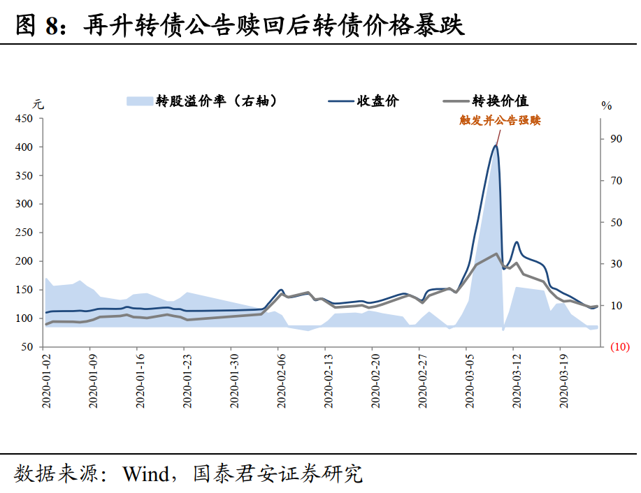 对于公告强赎前转股溢价率较高的转债,公告强赎对转债价格的冲击明显。转股溢价率急剧压缩为0,转债价格暴跌。如再升转债。