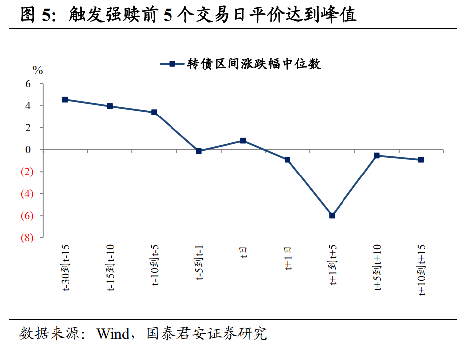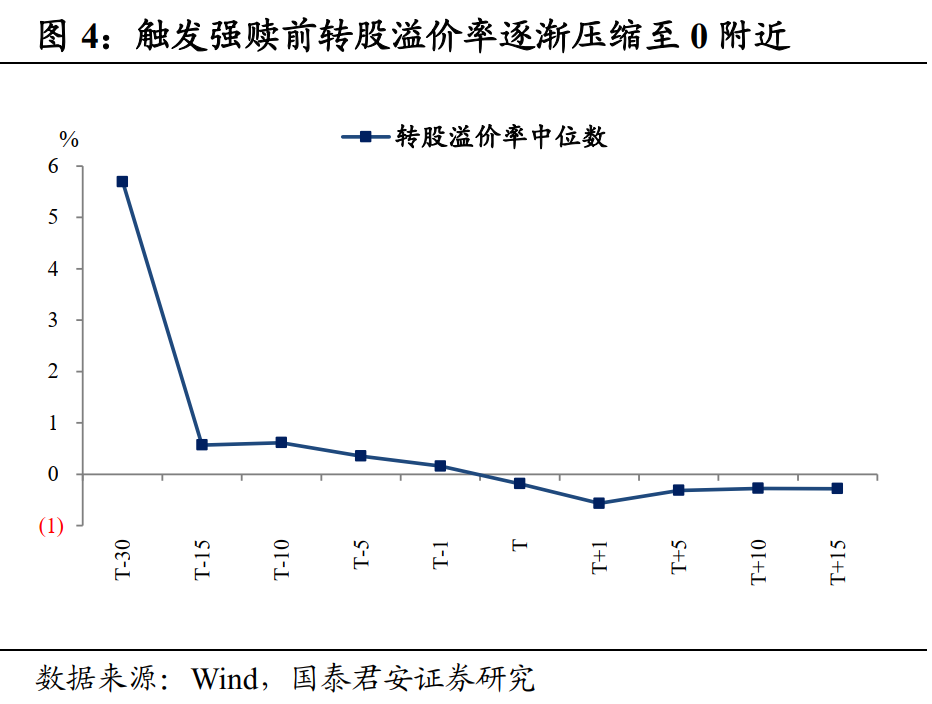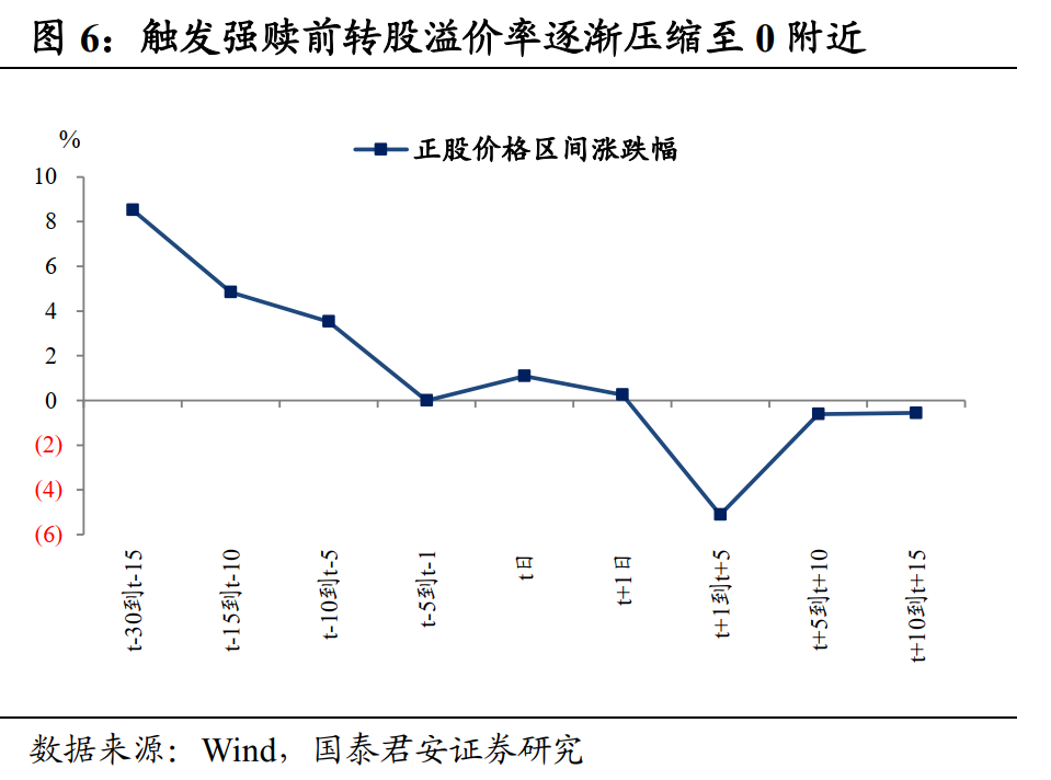 可转债触发强赎前后的短期投资机会。①转股溢价率小于0时的折价套利策略。投资者可在T日买入转股溢价率小于0的可转债并转股,在T+1日卖出股票。只要T+1日正股下跌幅度不超过T日负溢价幅度,投资者就可能获得正收益。然而,进入转股期的转债负溢价幅度一般有限,而且会迅速被市场修正,投资者还需承担正股波动风险和交易费用,因此需要综合考虑正股资质、交易费用后做出投资决策。②在即将触发强赎前博弈强赎条款的达成。有些公司促转股意愿较强,当平价达到强赎触发价时,公司会尽量维持股价促成强赎条款的达成。投资者可在平价达到130元之后又回调到130元以下时买入,待价格回到130元以上时卖出。或者反过来,在正股价格达到转股价*1.3之后回调时买入正股,待股价回到转股价*1.3以上卖出正股。