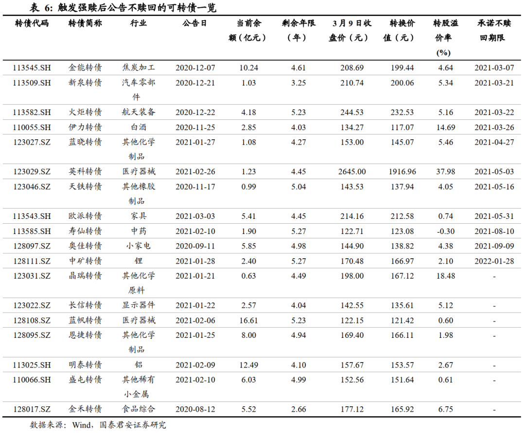 3. 对于触发强赎后公告不赎回的转债,如果承诺不赎回的时间段,则“安全期”内强赎风险较小;如果没有承诺不赎回的时间段,应规避转股溢价率高且剩余规模较小的转债,这类标的容易成为游资炒作的对象,如晶瑞转债。其余转债的股性较强,可选择正股有上涨动力的转债,如顺周期的明泰转债、盛屯转债。