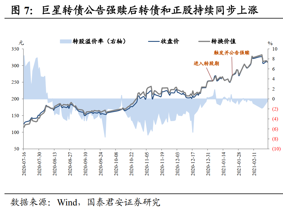 对于触发强赎前转股溢价率在0附近的转债,我们认为冲击效应主要取决于正股上涨的动力。对于正股本身有较强上升动力的转债,强赎公告对转债价格的冲击效应较小,如巨星转债,公告强赎后转债价格和正股价格持续同步上涨直到赎回。部分转债发行人的促转股意愿在强赎达成中起了很大作用,在强赎达成后这种支撑股价的动力不再,转债和正股价格回落明显。