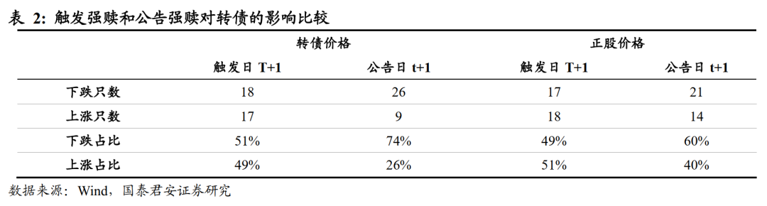 ①公告强赎对转债和正股价格的冲击效应大于触发强赎
