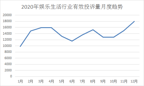 从投诉量月度走势看,2020年娱乐生活行业的投诉量于12月份达到峰值,有效投诉共1.8万余单,因年底各平台发起的会员折扣、优惠礼包等促销活动较多,致使影音直播和娱乐票务领域的投诉量剧增。