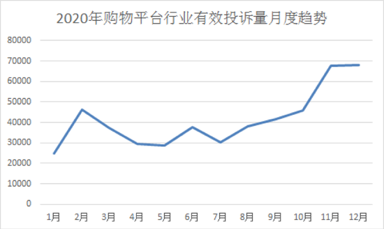 从投诉量月度走势看,2020购物平台的投诉量于年底月份达到峰值,有效投诉共7.5万余单,“双十一”,“双十二”购物节成为十一月和十二月投诉量暴涨的主要原因。