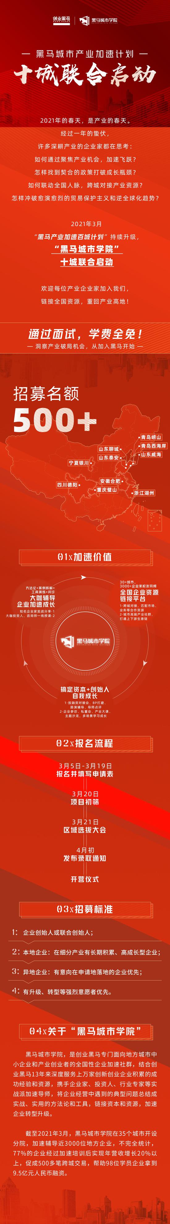本次联合启动是黑马“百城加速平台”在2021年的重要起步,黑马城市学院与青岛、合肥、重庆、威海、聊城、泰安、银川、湖州、德阳等10个国内重要的产业城市/地区联合,邀请希望在全面推动产业升级环境中把握更多机会、实现产业加速的企业家加入“黑马城市学院”,集中各城市的地方资源,以及创业黑马的产业加速服务体系,提升企业升级效率。