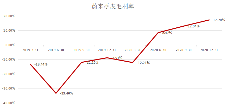 毛利率方面,蔚来2020Q4的毛利为17.2%,连续3个季度为正。2019年因为政府补贴水平下降,蔚来毛利率降至最低点-33.4%,随后稳步上扬。